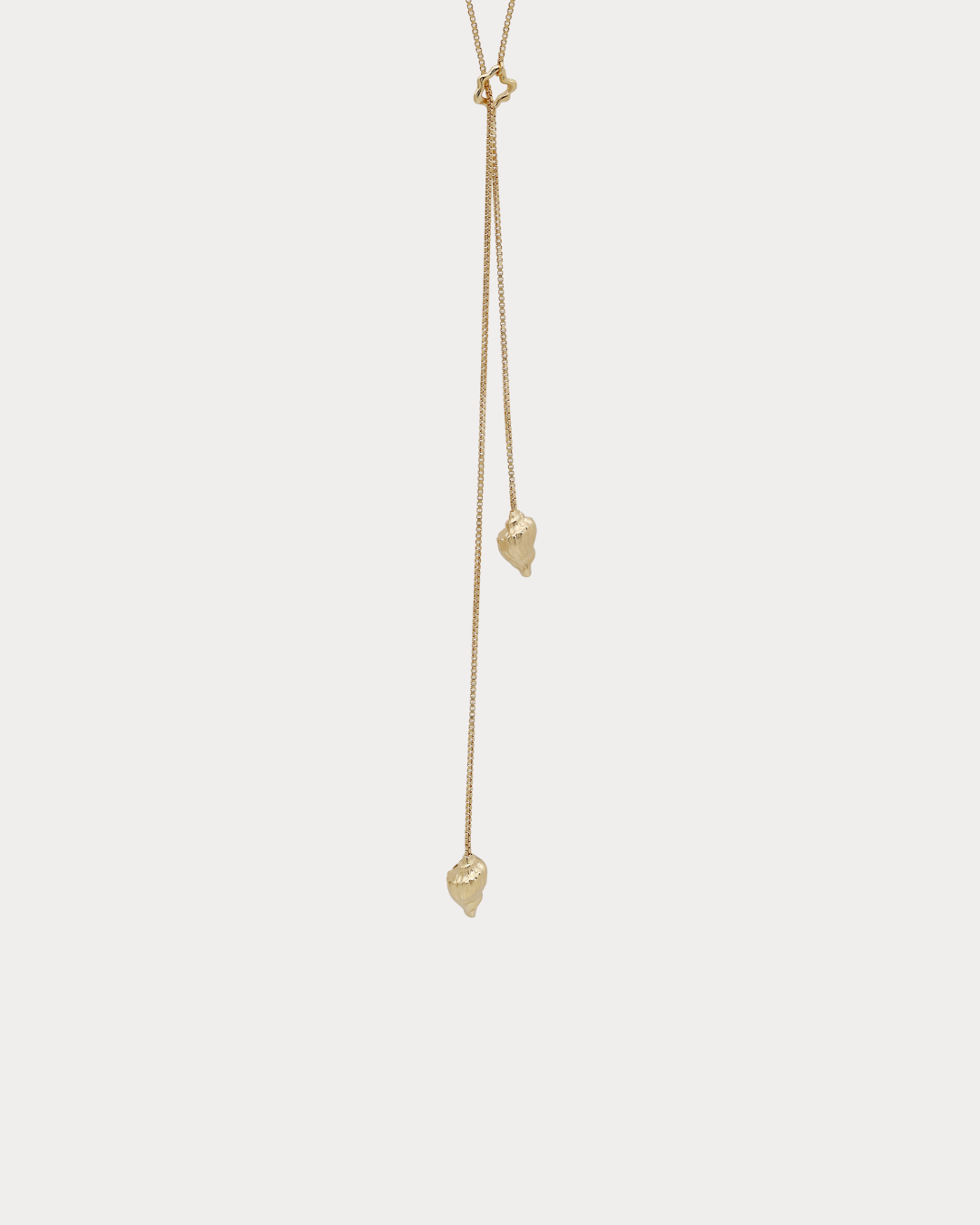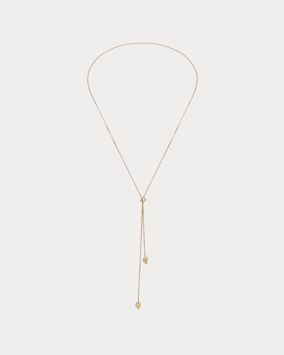 Delicate chain suspended between two hand-carved adjustable shells. Move them close for layering, or apart for statement wear.
