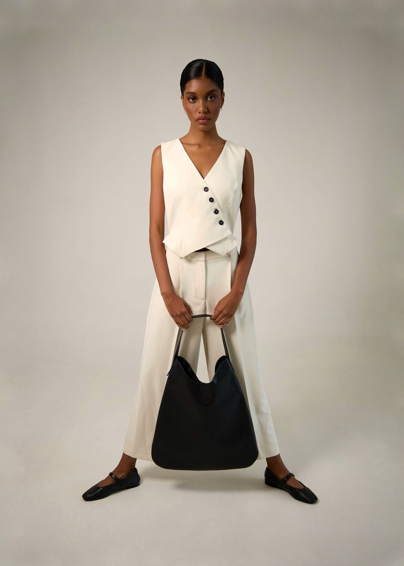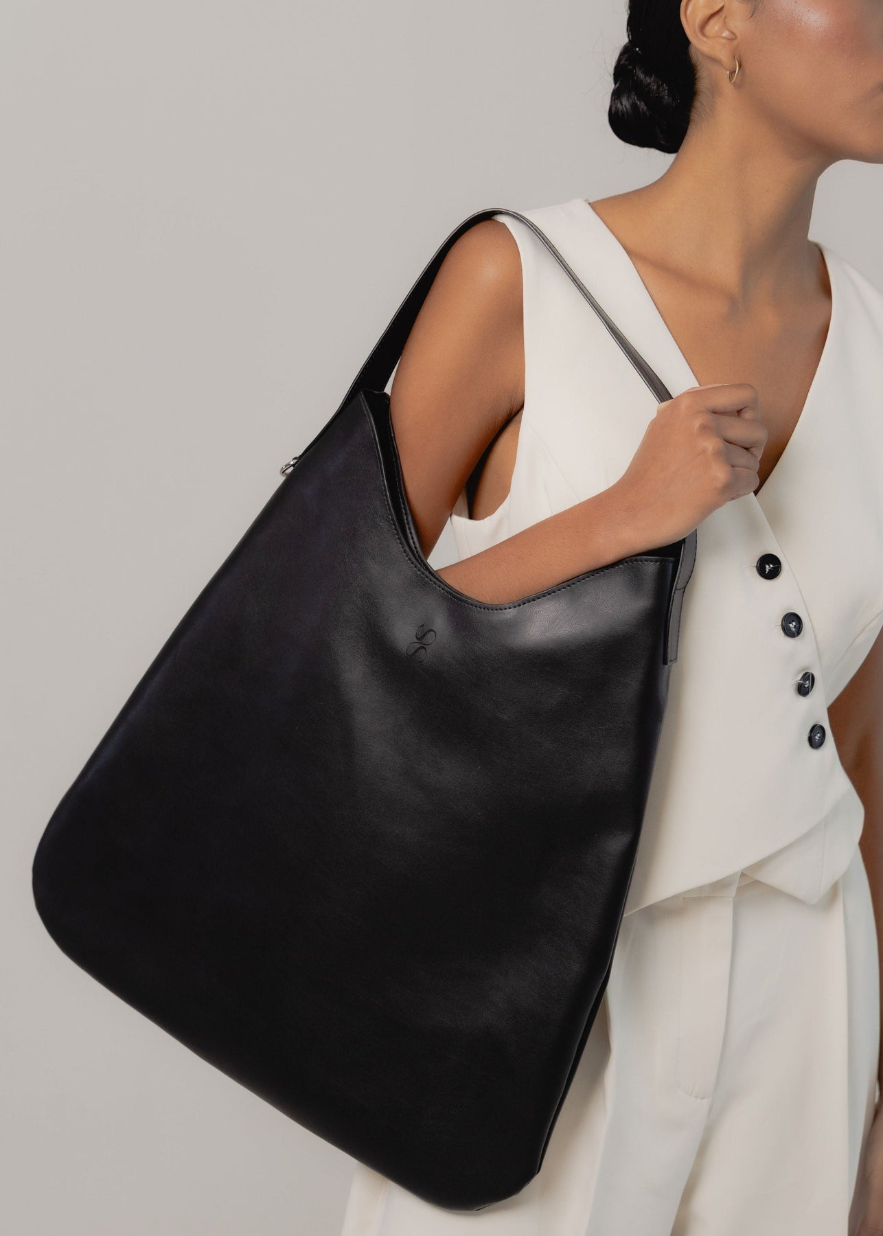 An internal zip pocket secures your essentials, while its generous interior accommodates everything from laptops and notebooks to evening attire, making it the perfect day-to-night bag. Though unstructured in feel, the design retains a sculptural character, embodying both artistry and function. The classic black tone amplifies its versatility, pairing seamlessly with any wardrobe and occasion.