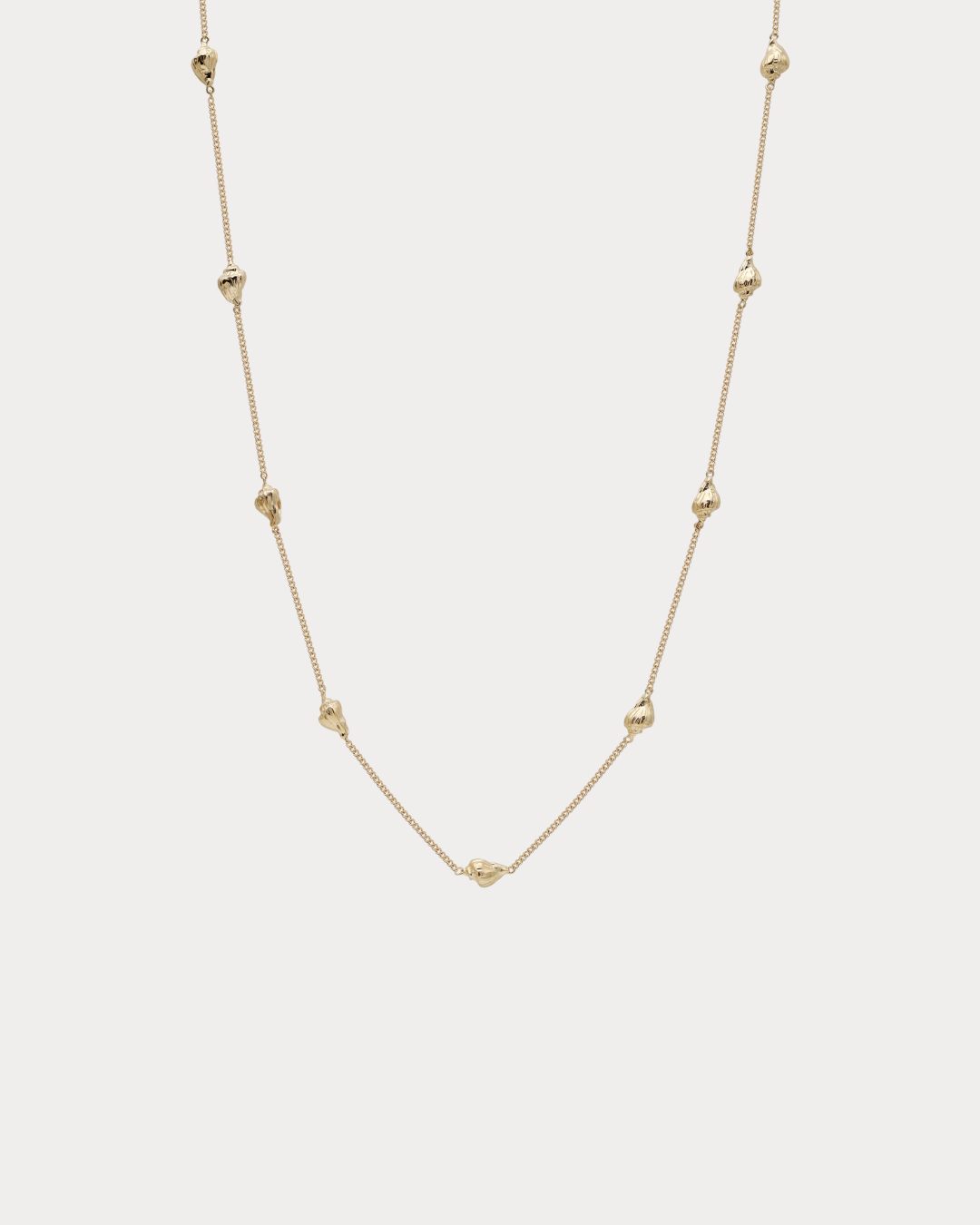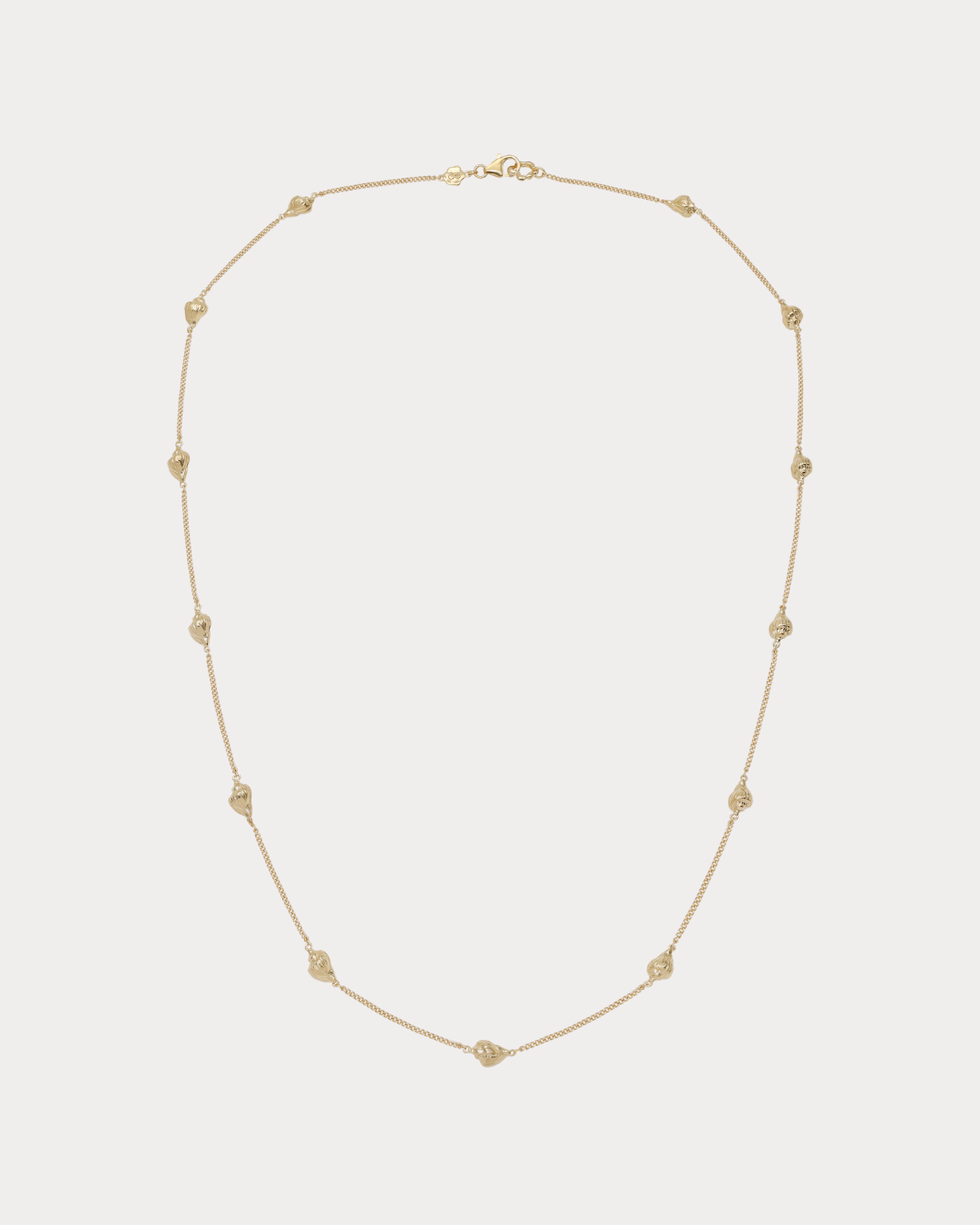 A delicate chain adorned with intricate hand-carved shells, connected by our signature organic ring clasp that becomes part of the design itself.